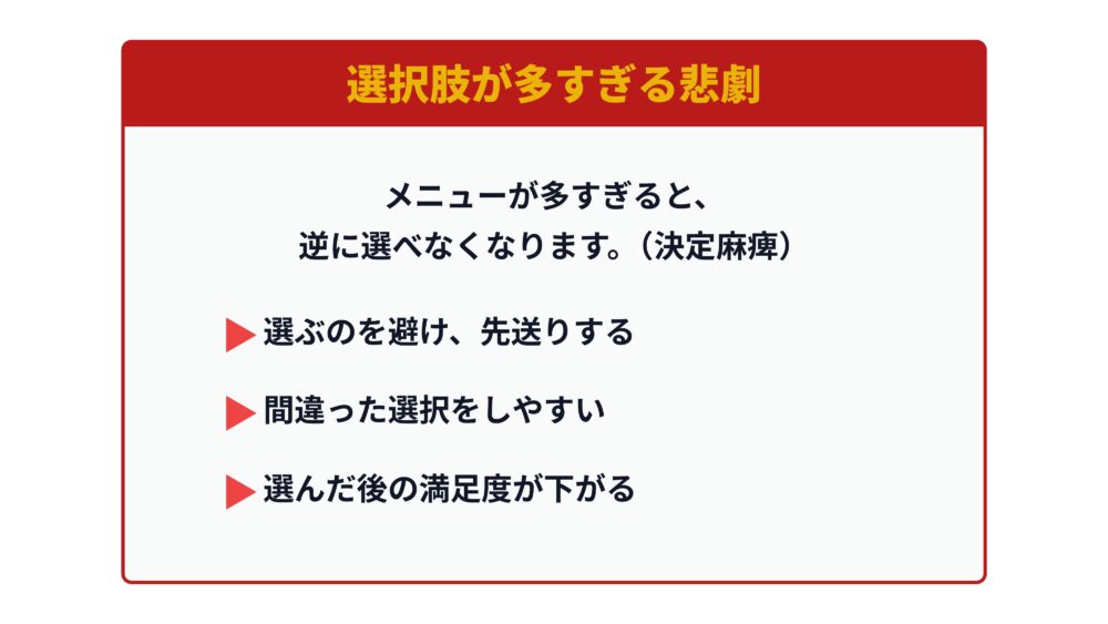 選択肢が多いほど、人は行動を先送りし、間違った選択をしやすくなり、終わった後の満足度も下がってしまいます。