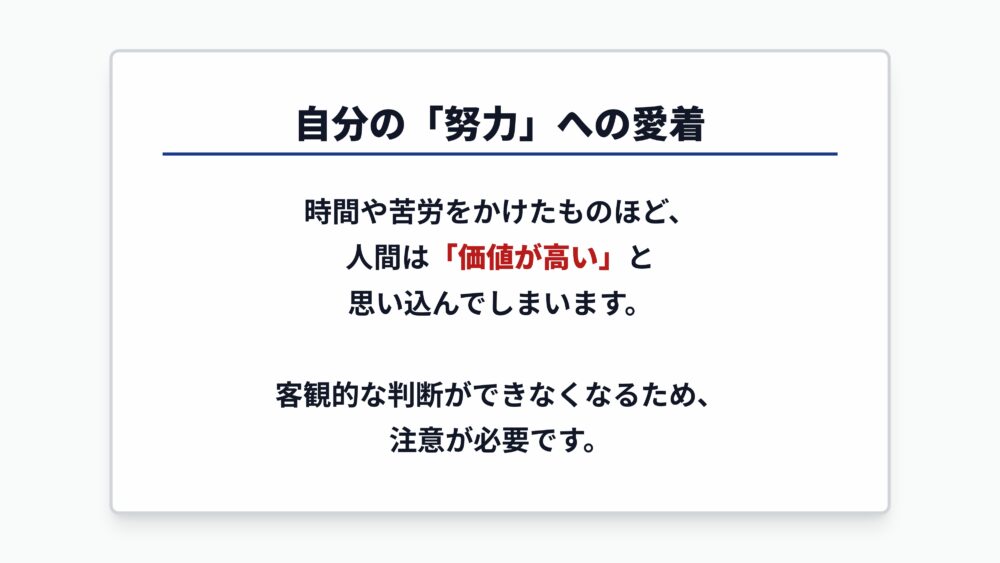 人間は、自分が時間や労力をかけて苦労したものに対して、実際以上に高い価値があると思い込んでしまいます。