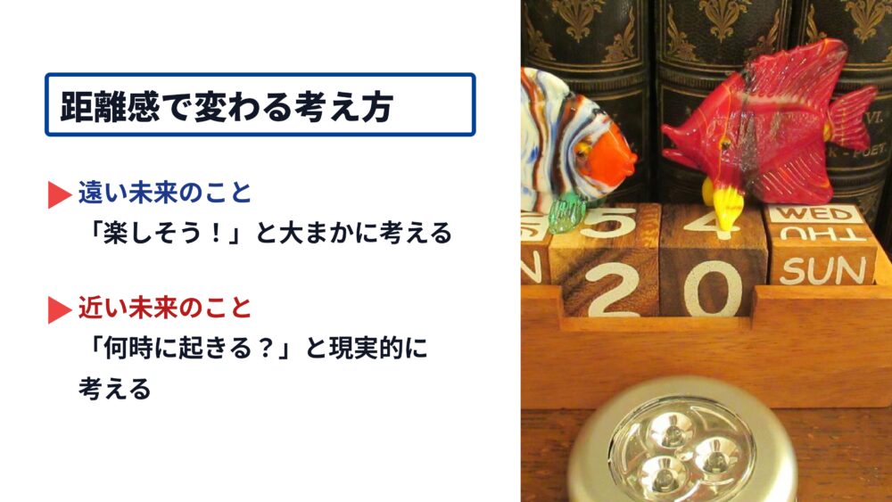 例えば、来年の旅行と言われると、景色が綺麗だろうなとワクワクしますが、明日の旅行と言われると、荷造りはどうしようと、現実的な心配ばかりしてしまいますよね。