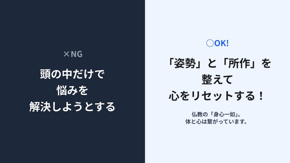 姿勢と所作を整えることで、心の状態をリセットしていきます。