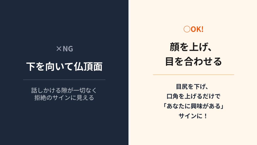 相手から気軽に話しかけてみようと思われるためには、普段から顔を上げて過ごし、周りの人に視線を向けることがとても大切です。