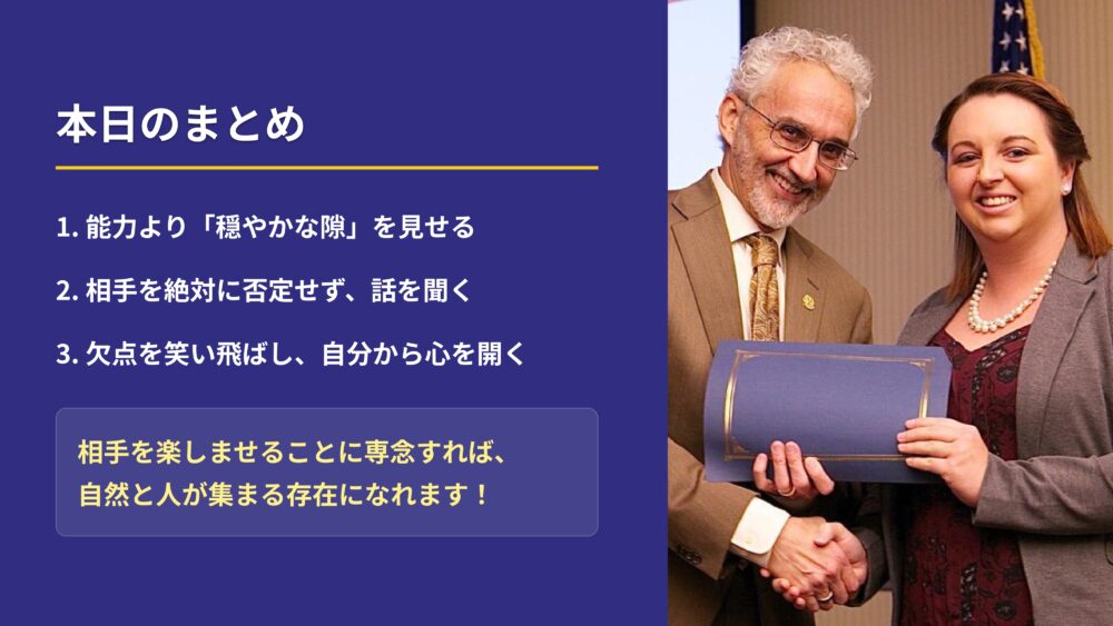 これであなたは、無理に優秀な自分を演じなくても、自然と人が集まってくる極意がわかるようになりましたね?