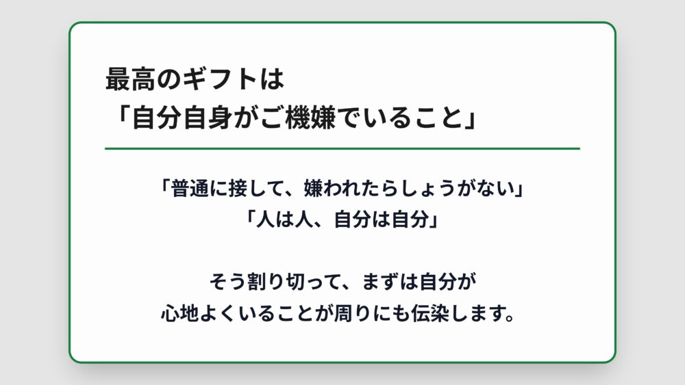 あなたが周りの人に与えることができる最高のギフトは、何よりもまず、自分自身がご機嫌でいようとすることなんです。