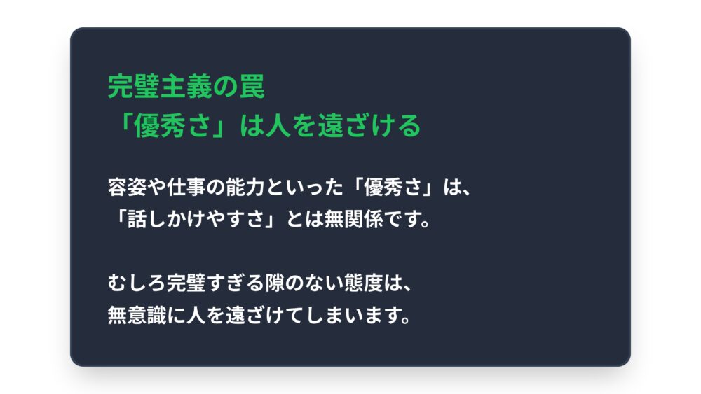でも、現実は全く逆で、完璧すぎる隙のない態度は、無意識のうちに周りの人を緊張させ、遠ざけてしまう原因になるんです。
