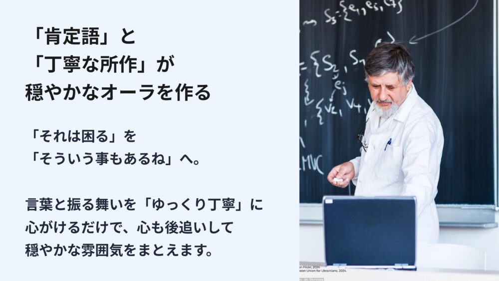 さらに、ゆっくり丁寧に話したり、ゆっくり丁寧にドアを閉めたりといった所作を意識してみてください。