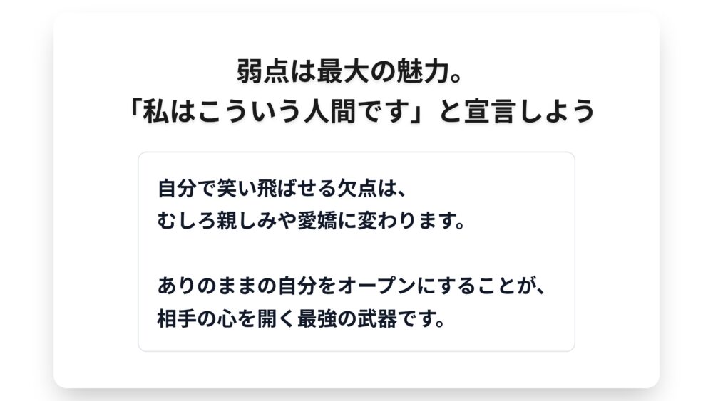 ただし、見せる欠点は、自分で笑い飛ばせるくらいのものにしておくのが絶妙なさじ加減です。