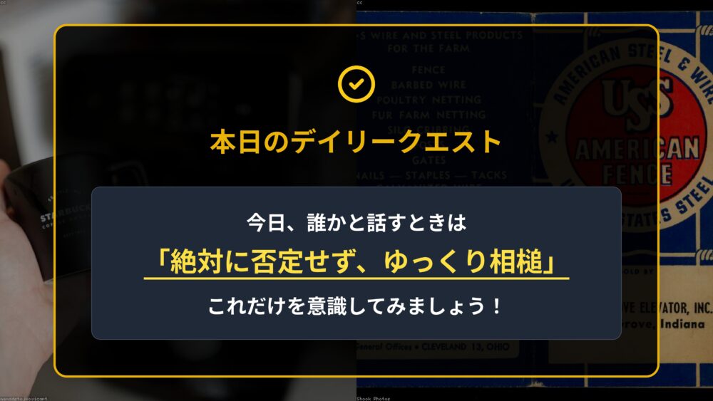 今日のデイリークエストは、今日誰かと話すときは、絶対に否定せず、ゆっくり相槌を打つこと。