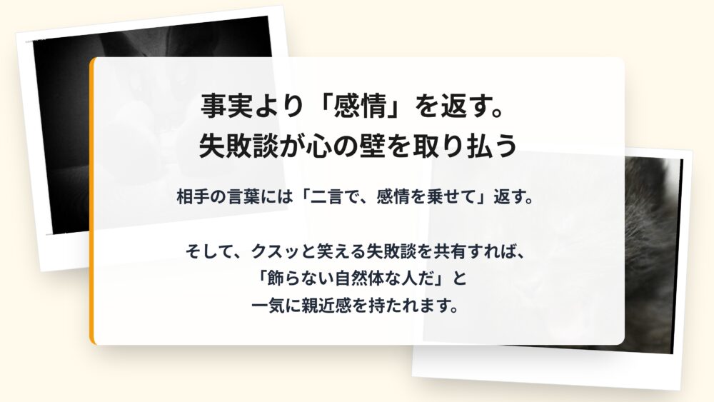 こういう少し情けなくて切ない失敗談を素直に話すと、この人でもこんな失敗をするんだ、と親近感を持たれます。