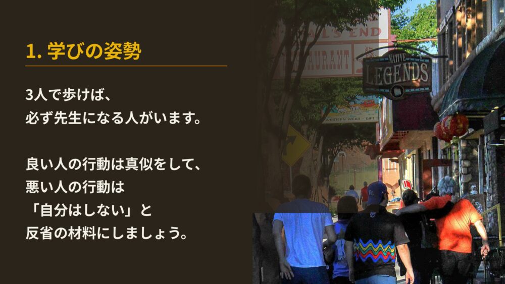 孔子は、三人で一緒に歩けば、必ずその中に自分の先生になる人がいると教えています。