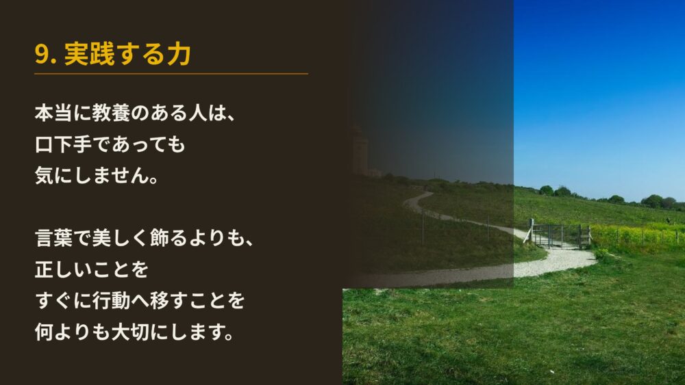これらを一つずつ丁寧に実践していく人こそが、揺るぎない自信を持った、真に教養のある人です。