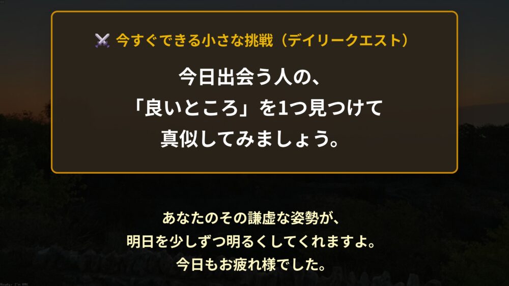 さあ、満足して終わらせないために、今すぐできる極めて簡単なクエストを出します。