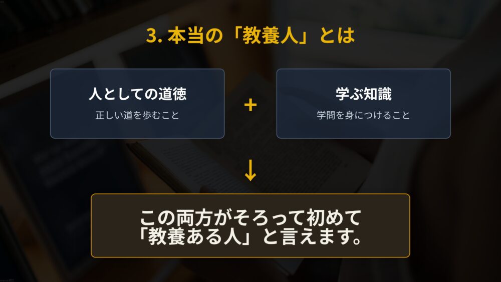 この二つが車の両輪のようにそろって、初めて教養ある人と呼ばれるようになります。