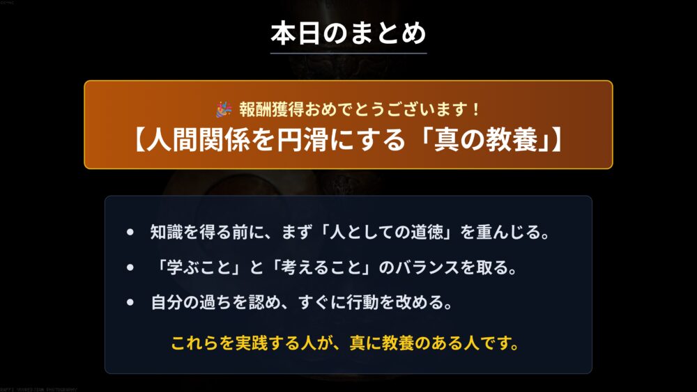 これであなたも、人間関係を円滑にする真の教養という、一生モノの武器を手に入れましたね。