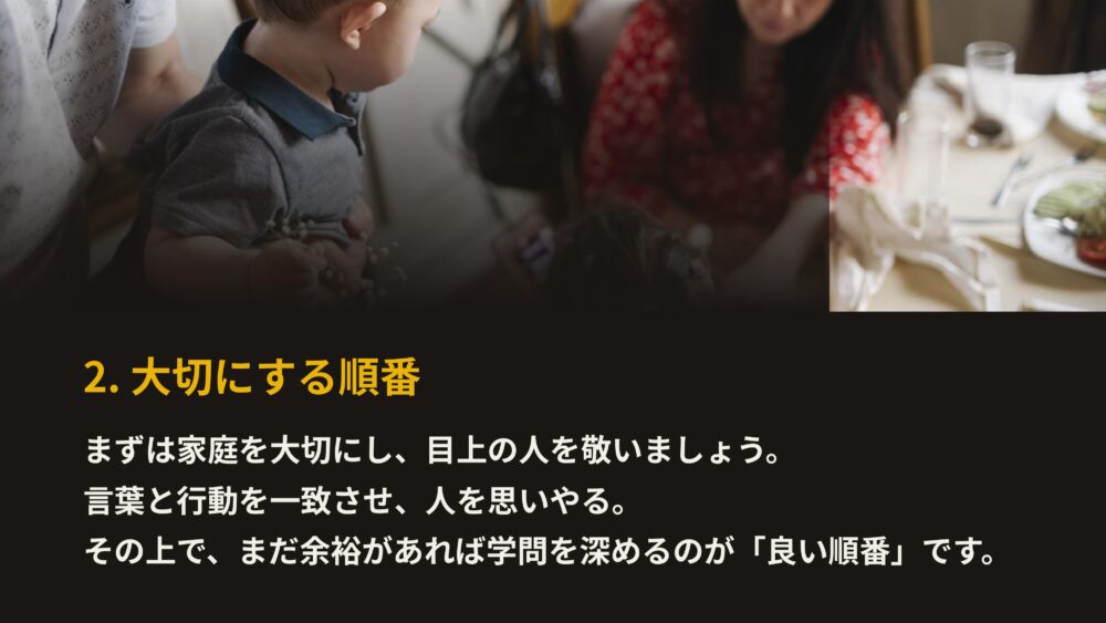 そして、それらをしっかり行った上で、まだ心と時間に余裕があるならば、学問を深めなさいと教えています。