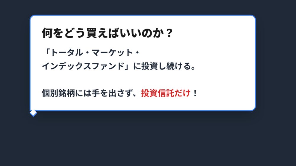 正解はトータルマーケットインデックスファンドと呼ばれるものに、投資し続けることです。