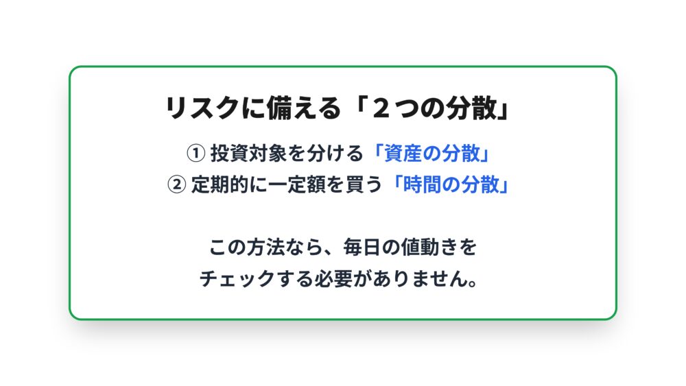 ですがこの時間の分散を使えば、もう日々の値動きをチェックして一喜一憂する必要はなくなります。
