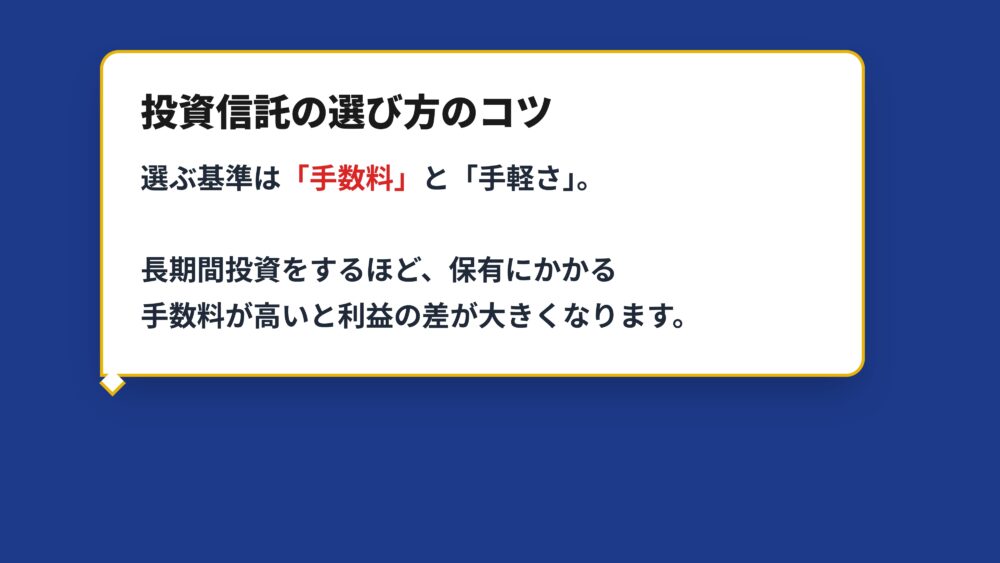 投資信託を選ぶときに絶対に見てほしいのが、手数料の安さと手軽さです。