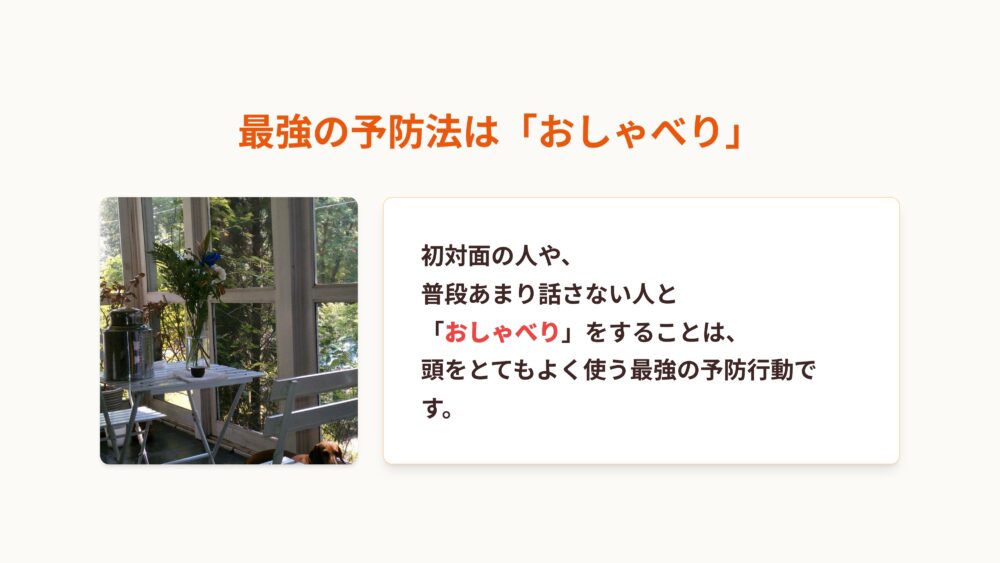 実は数ある活動の中でも、最強の予防法と呼ばれているのが……人との何気ないおしゃべりなのです。