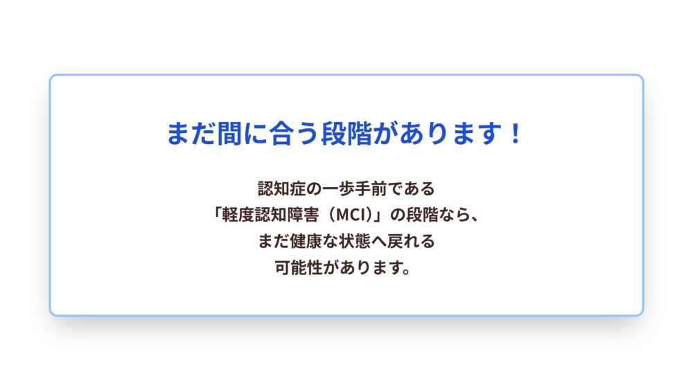 しかし実は、認知症の一歩手前である軽度認知障害という段階であれば、まだ間に合う可能性があります。