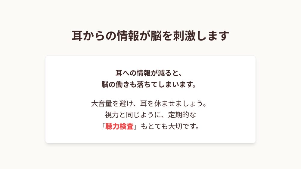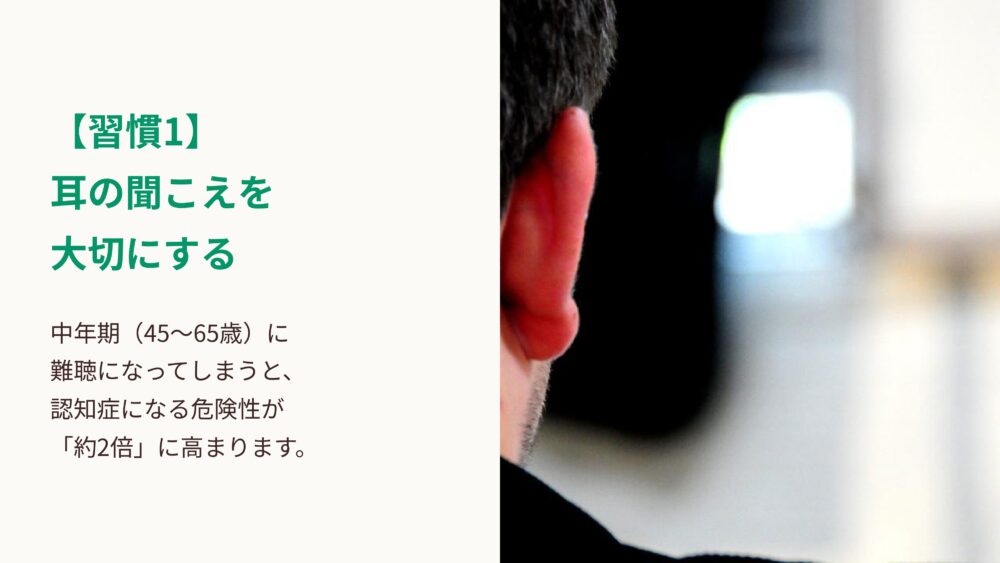 予防のための習慣の一つ目は、耳の聞こえを大切にすることです。