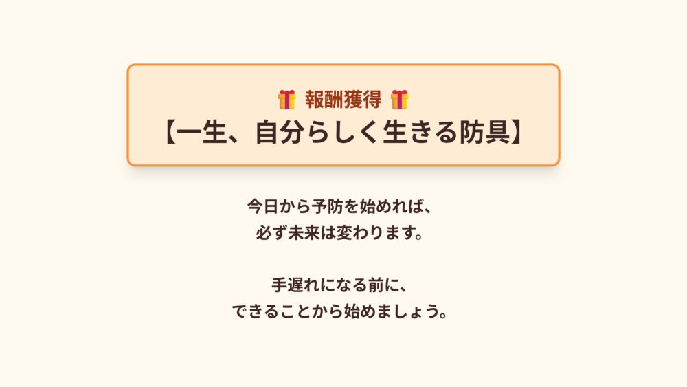 今日は手遅れになる前にやるべき習慣をお伝えし、一生自分らしく生きるための防具を授けます。