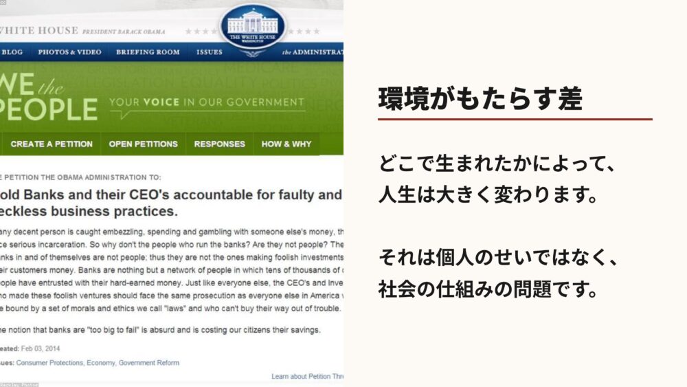 貧しい環境で生まれたのは、個人の責任ではなく、社会の仕組みが生み出した結果なのです。