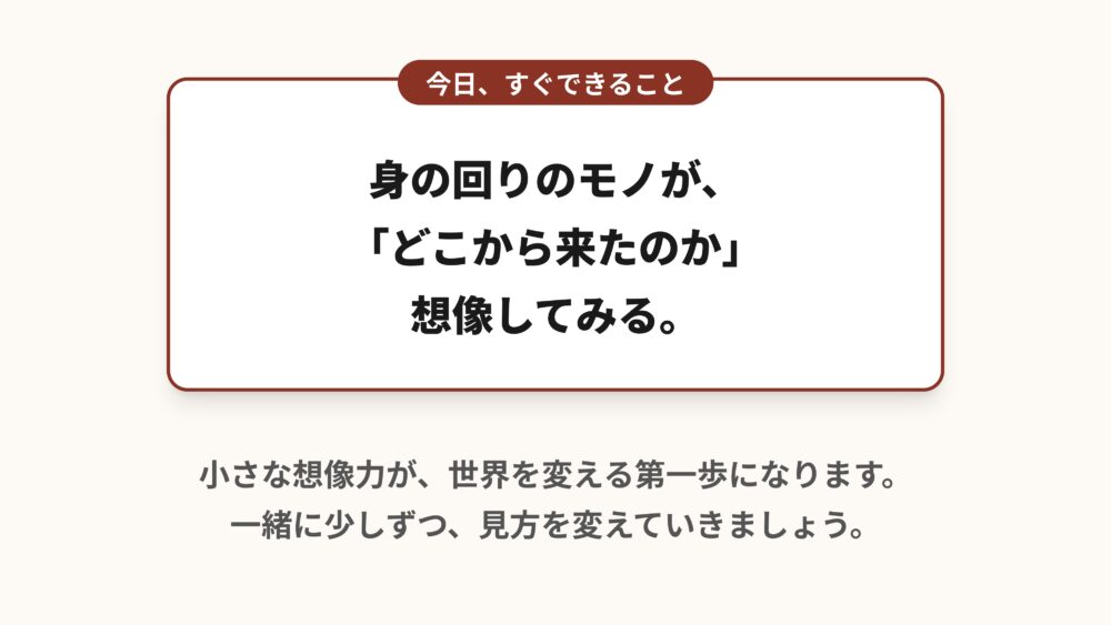 それは、あなたの手元にあるスマートフォンや、今着ている服を見て、これがどこから来たのか一分間だけ想像してみることです。