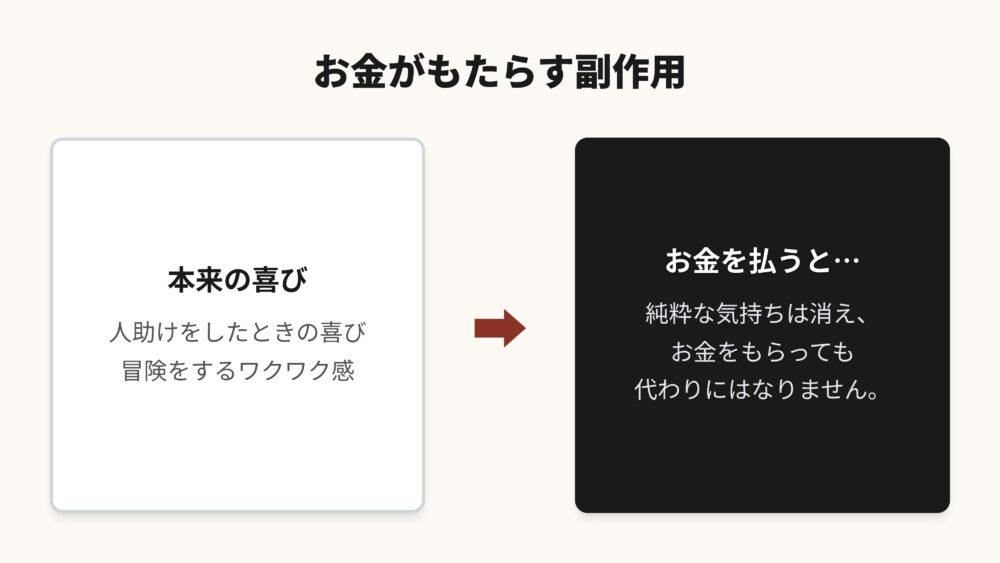 お金は便利な道具ですが、私たちの心から、純粋な感情を奪ってしまう副作用を持っているんですね。