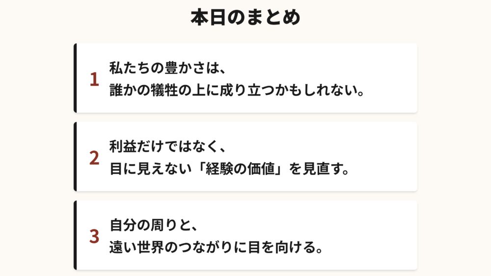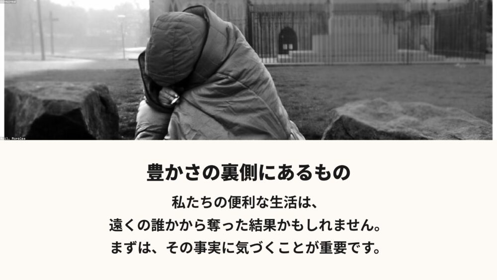 一つ目は、私たちの安くて便利な生活は、遠く離れた誰かの犠牲の上に成り立っているかもしれないということ。