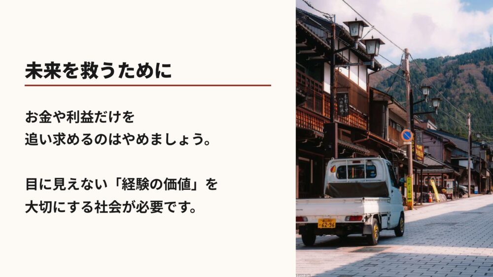 しかし、人間と地球を救うためには、目に見えない経験の価値を、もう一度尊重する社会にするしかありません。