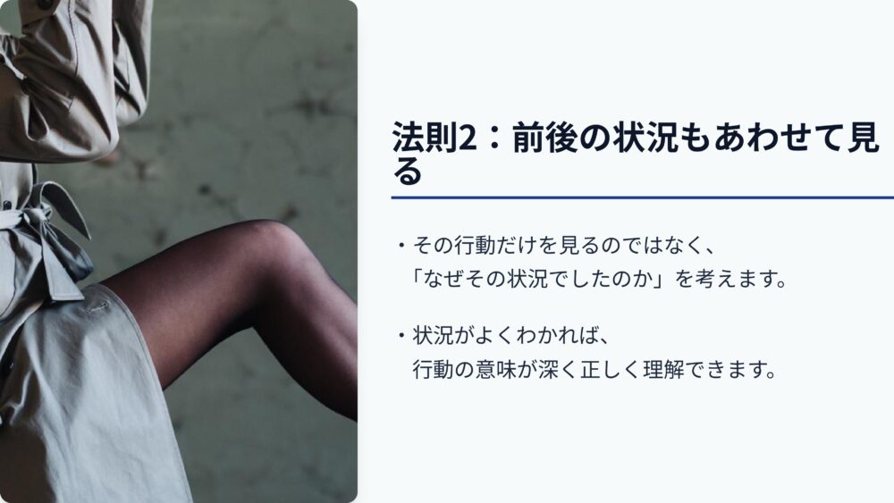 第二の法則は、その行動が起きた前後の状況もあわせて見ることです。