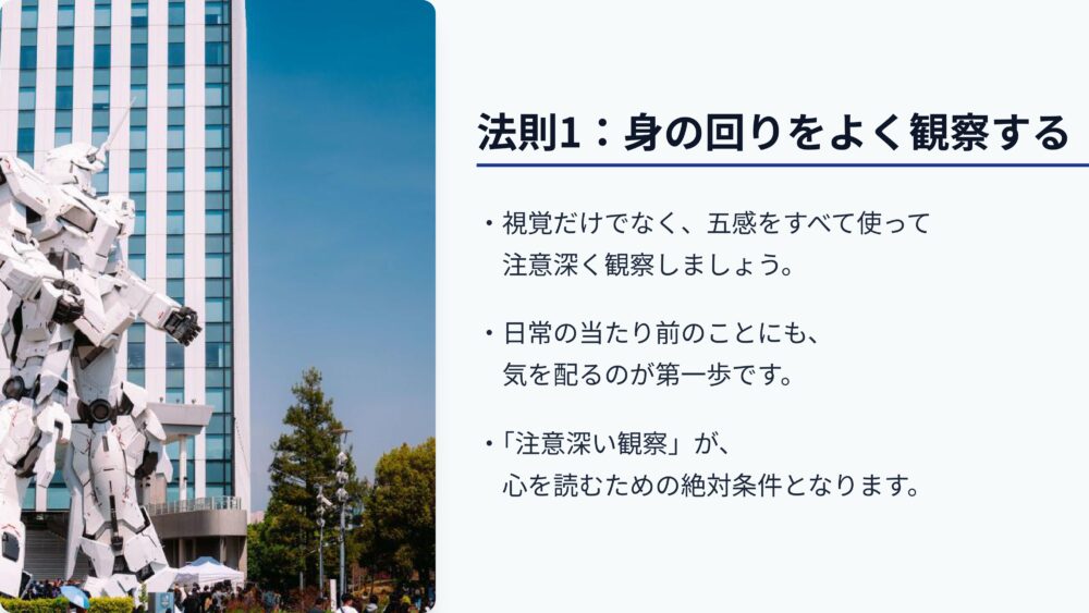 第一の法則は、身の回りを的確に観察することです。