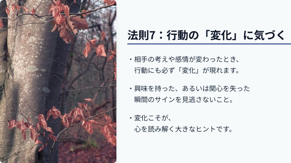 そして第七の法則は、行動の変化に気づくことです。