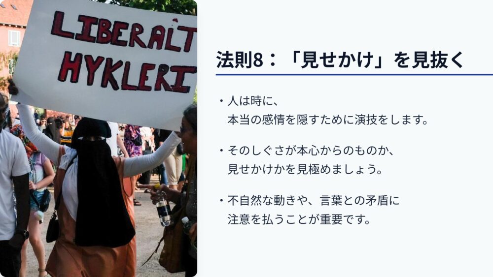 第八の法則は、見せかけを見抜くことです。