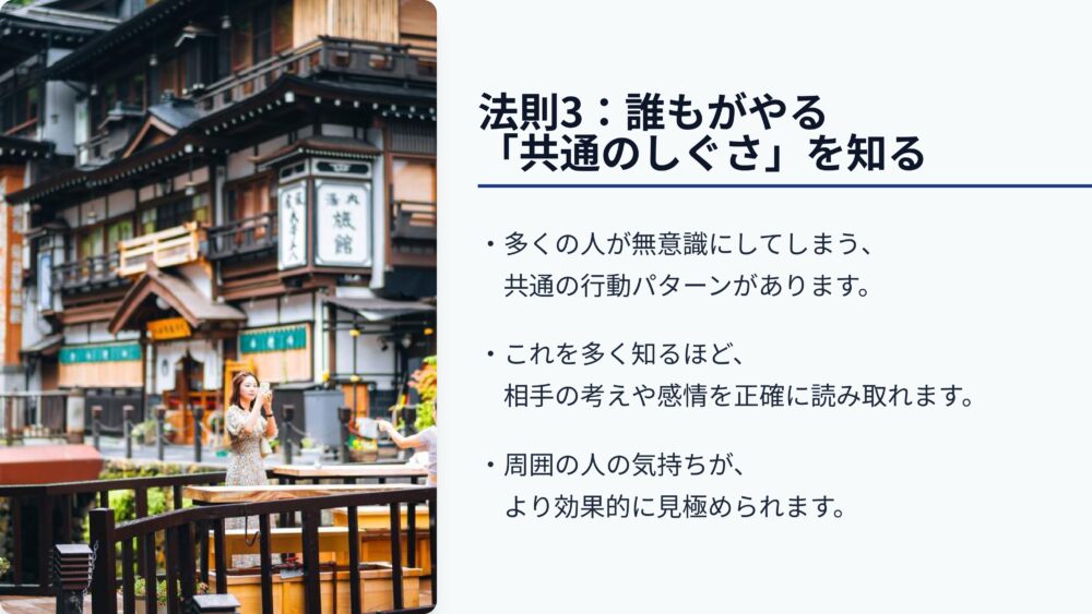 第三の法則は、誰もがやってしまう共通のしぐさを知ることです。
