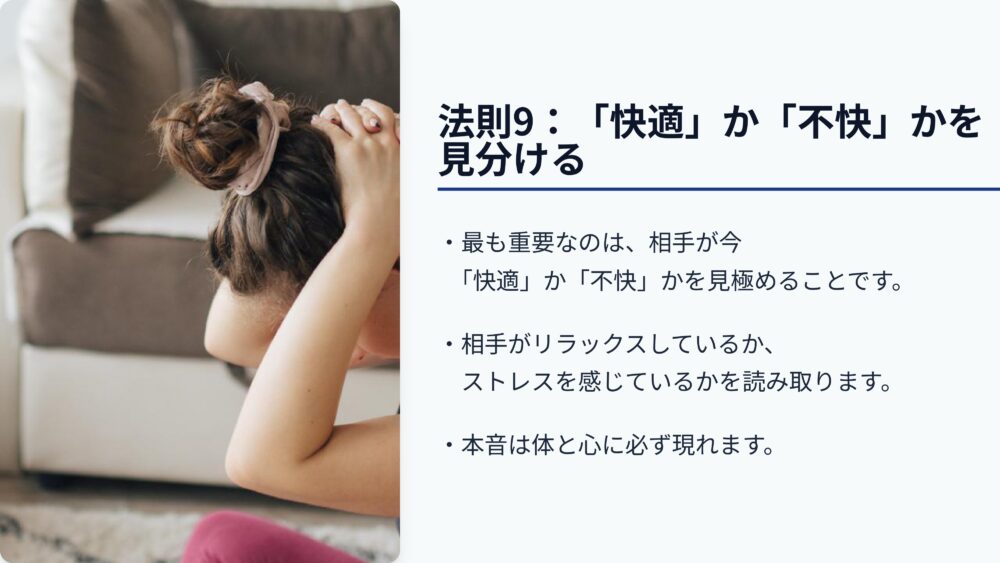 第九の法則は、相手が快適か、不快かを見分けることです。