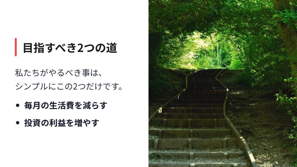 私たちがやるべきことは、毎月の生活費を減らすことと、投資の利益を増やすことの二つだけです。