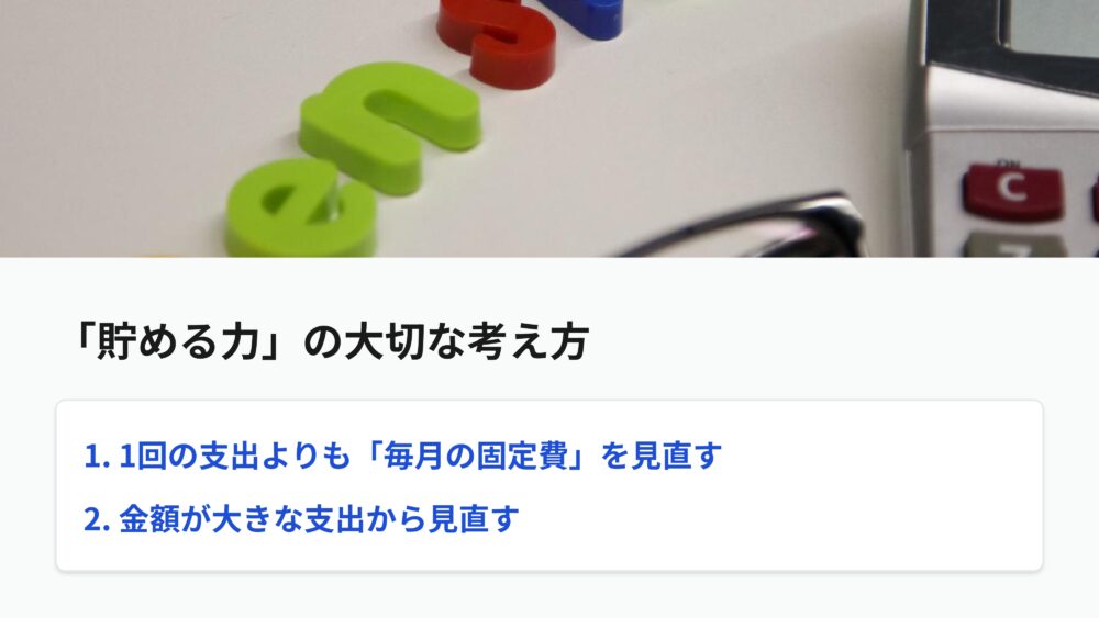 貯める力をつけるために大切なのは、毎月の固定費を見直すことと、金額の大きな支出から見直すことです。