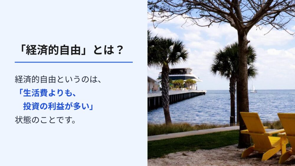 経済的自由というのは、毎月の生活費よりも投資で得られる利益が多い状態のことです。