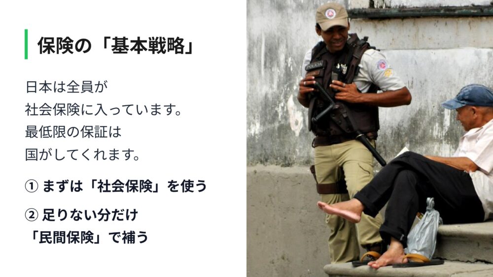 保険の基本戦略とは、まずは国が用意してくれている社会保険を最大限に使うことです。