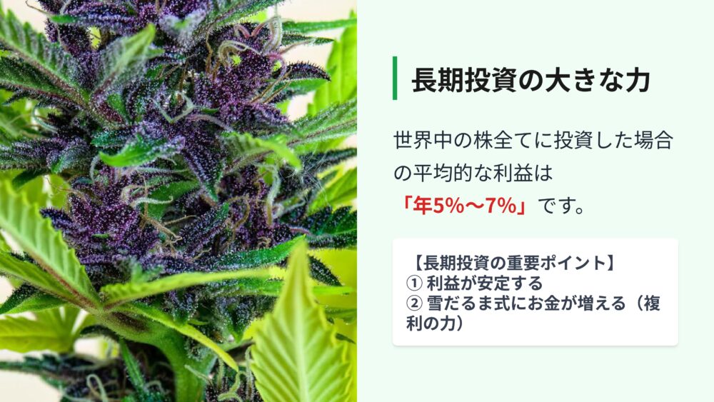 世界中の株すべてに広く投資をして、じっくりと長く持ち続けた場合、平均して毎年5%~7%ずつお金が増えていくと言われています。