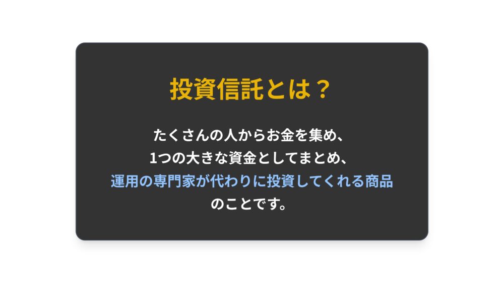 これは、たくさんの人から少しずつお金を集めてひとつの大きな資金を作り、運用のプロが代わりに様々な会社の株などに投資をしてくれる商品のことです。