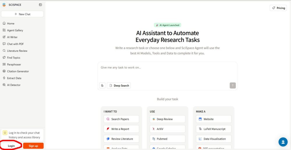 ①「SCISPACE」へ移動し、画面左下のLoginを押す。