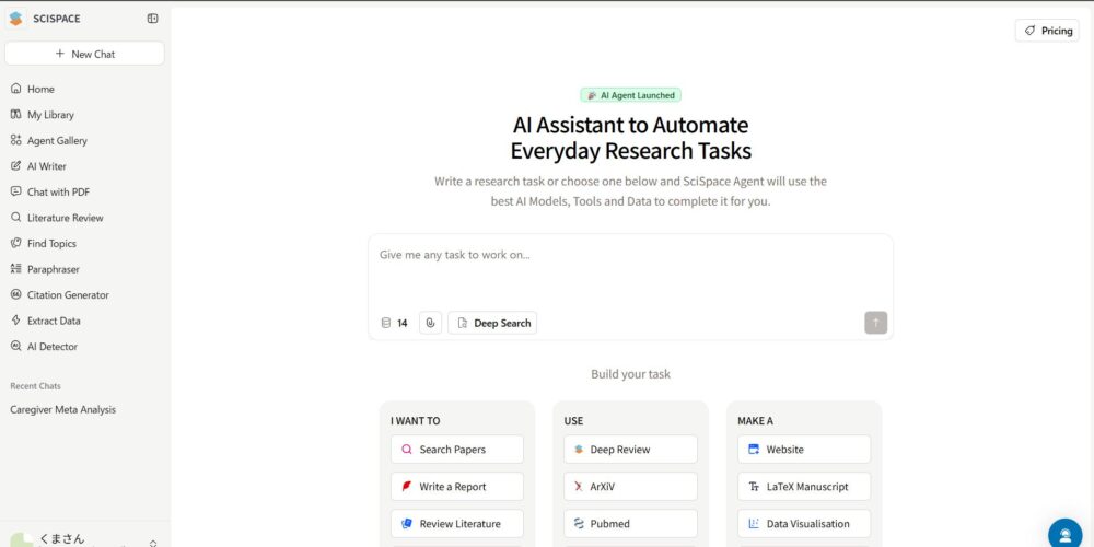 • 概要:SCISPACEは、論文の検索、読解、執筆をAIでサポートする研究者向けのプラットフォームです。