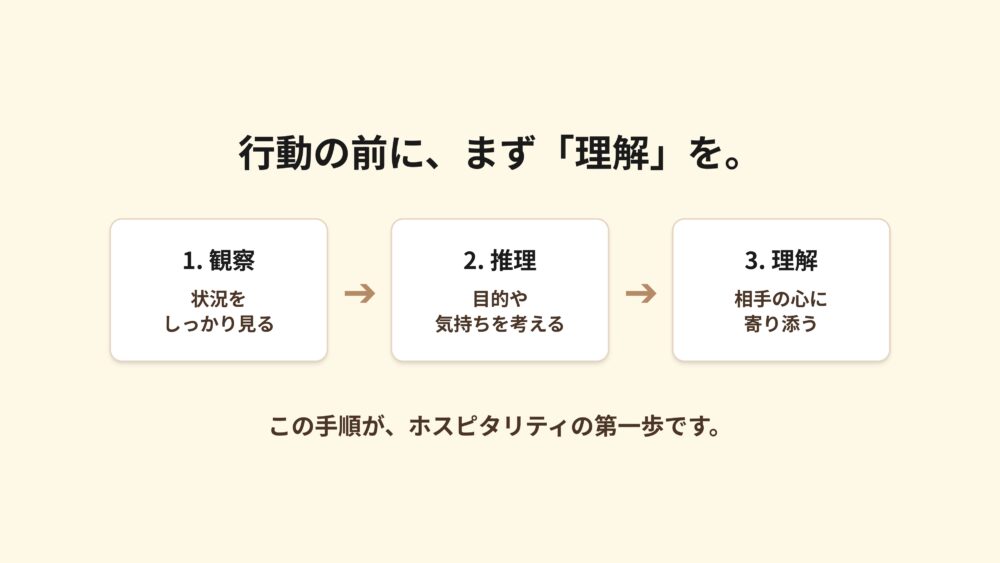 相手に合わせた対応をするための正しい手順は、行動の前にまず理解をすることです。