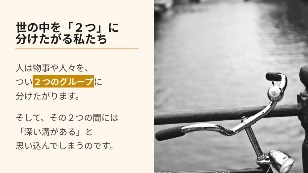 私たち人間は物事や人々を、つい極端な二つのグループに分けたがります。