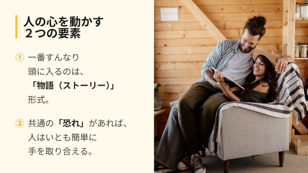 人は無味乾燥な説明よりも、自分の人生に関わる物語を一番すんなりと受け入れることができます。