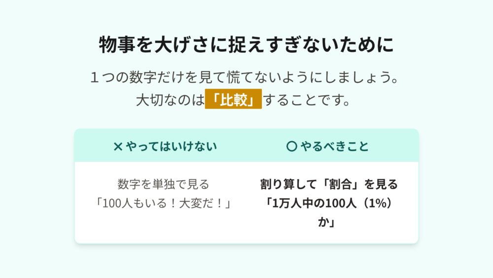 一つの出来事や数字だけを見て慌てないためには、比較することがとても大切です。