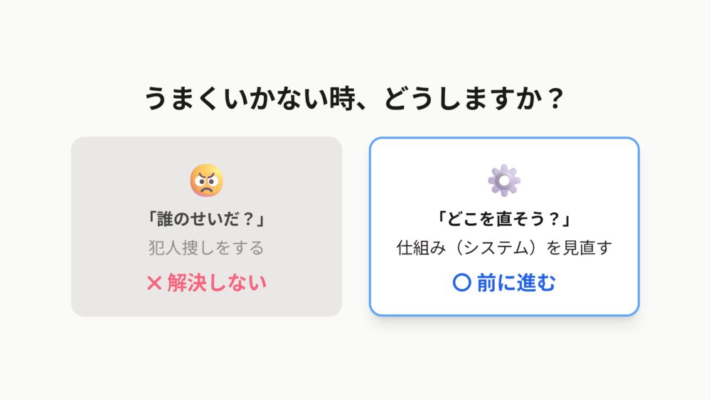 大切なのは、誰が悪いのかを探すのではなく、どこを直せばいいのかという、仕組みそのものを見直すことです。