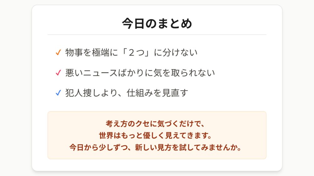 この考え方のクセに気づくだけで、あなたの周りの人間関係は、今までよりもずっと優しく見えてくるはずです。